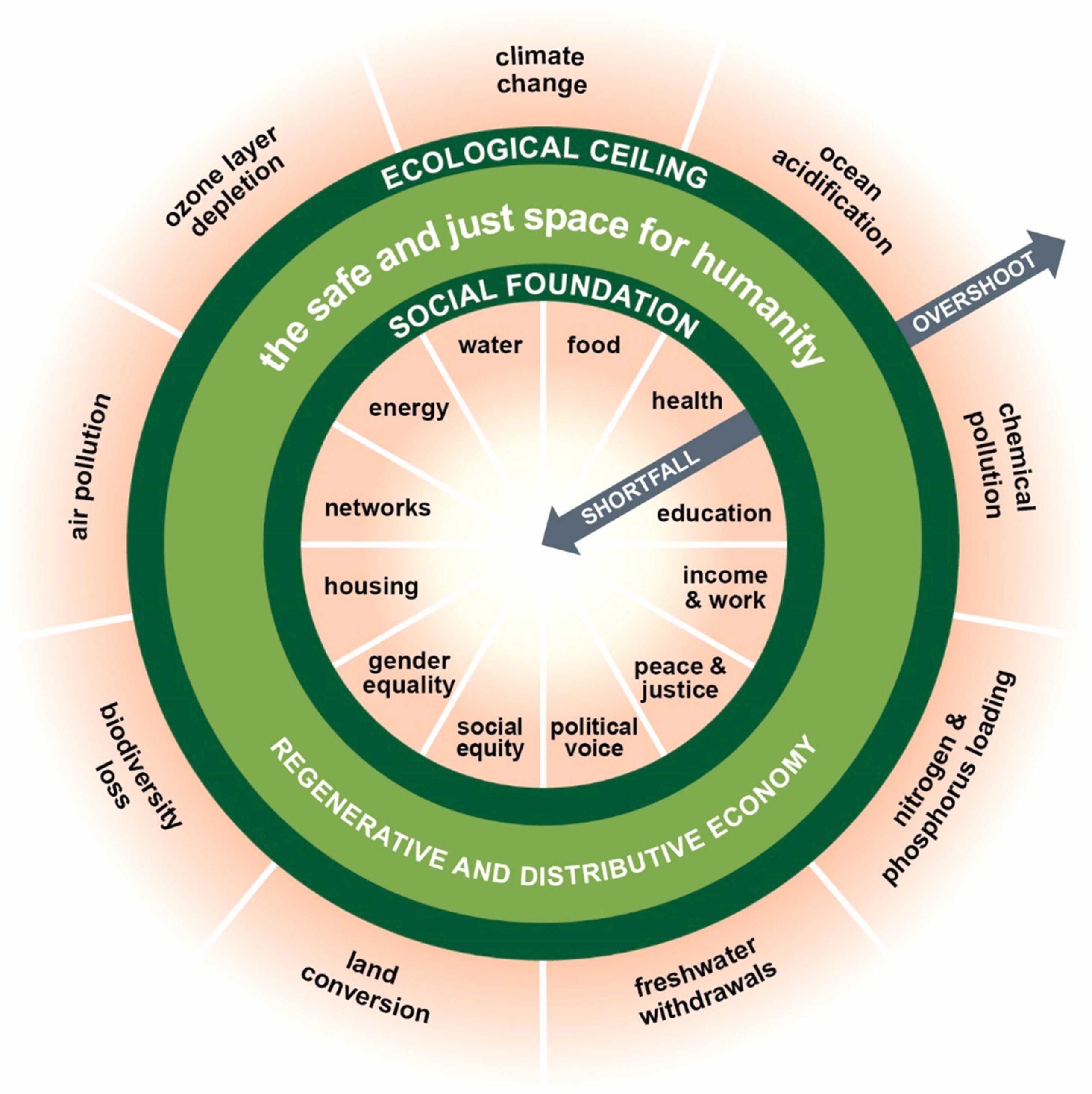 Two critical thresholds for human societies form the framework’s core: the environmental ceiling, above which the consumption of natural resources leads to critical planetary degradation, and the social foundation, below which the consumption of natural resources leads to critical human deprivation. The doughnut-shaped space between these thresholds represents “a safe and just space for humanity,” which should be the goal of all economic activity.